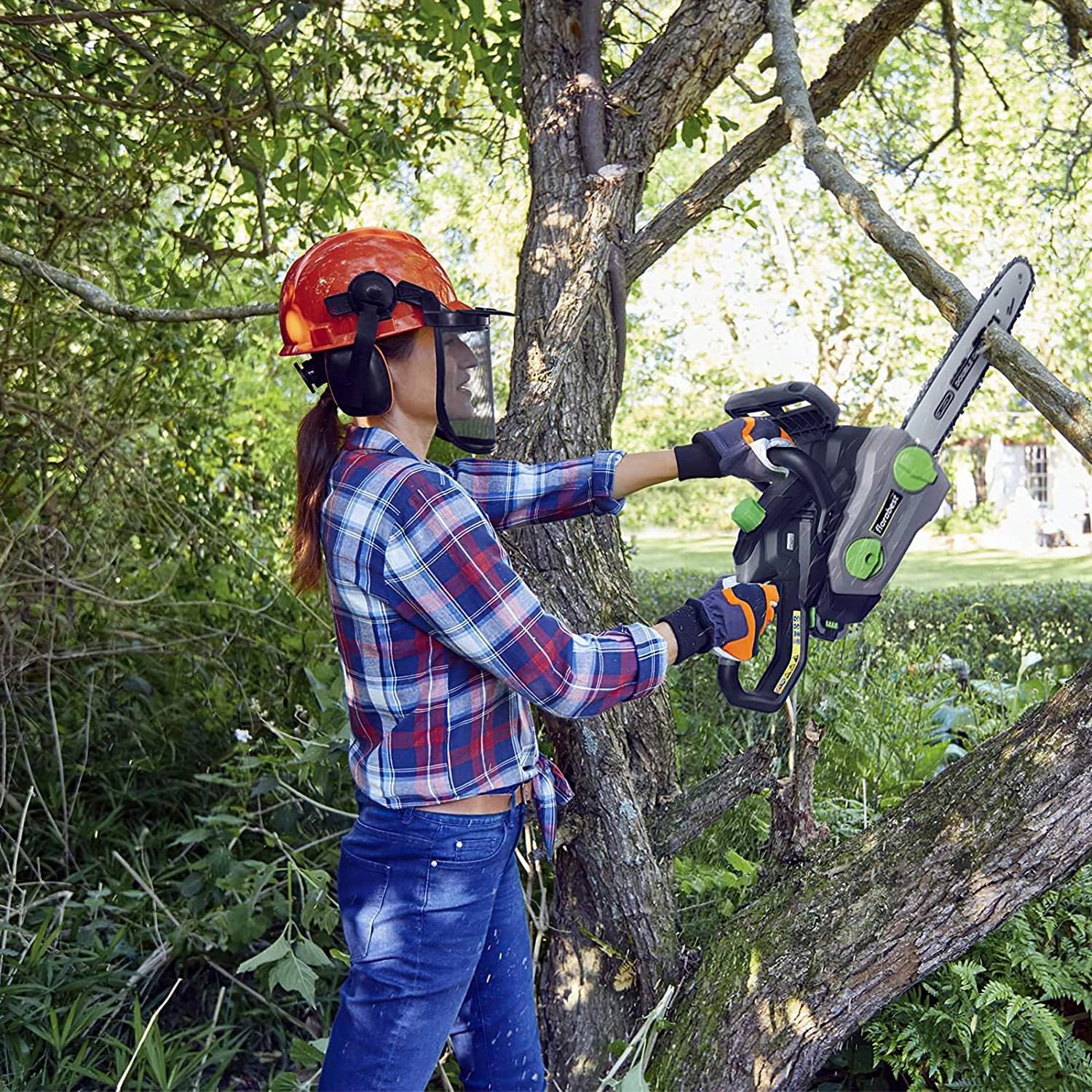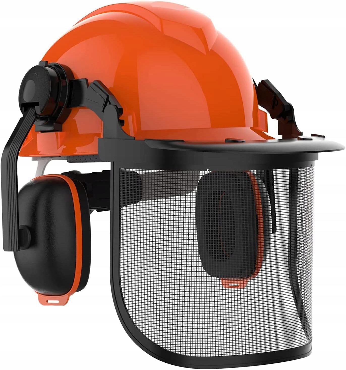 Kask do piły łańcuchowej z osłoną twarzy i nausznikami: hełm ochronny składa się z kasku, regulowanych/zdejmowanych nauszników, plastikowego i siatkowego wizjera.