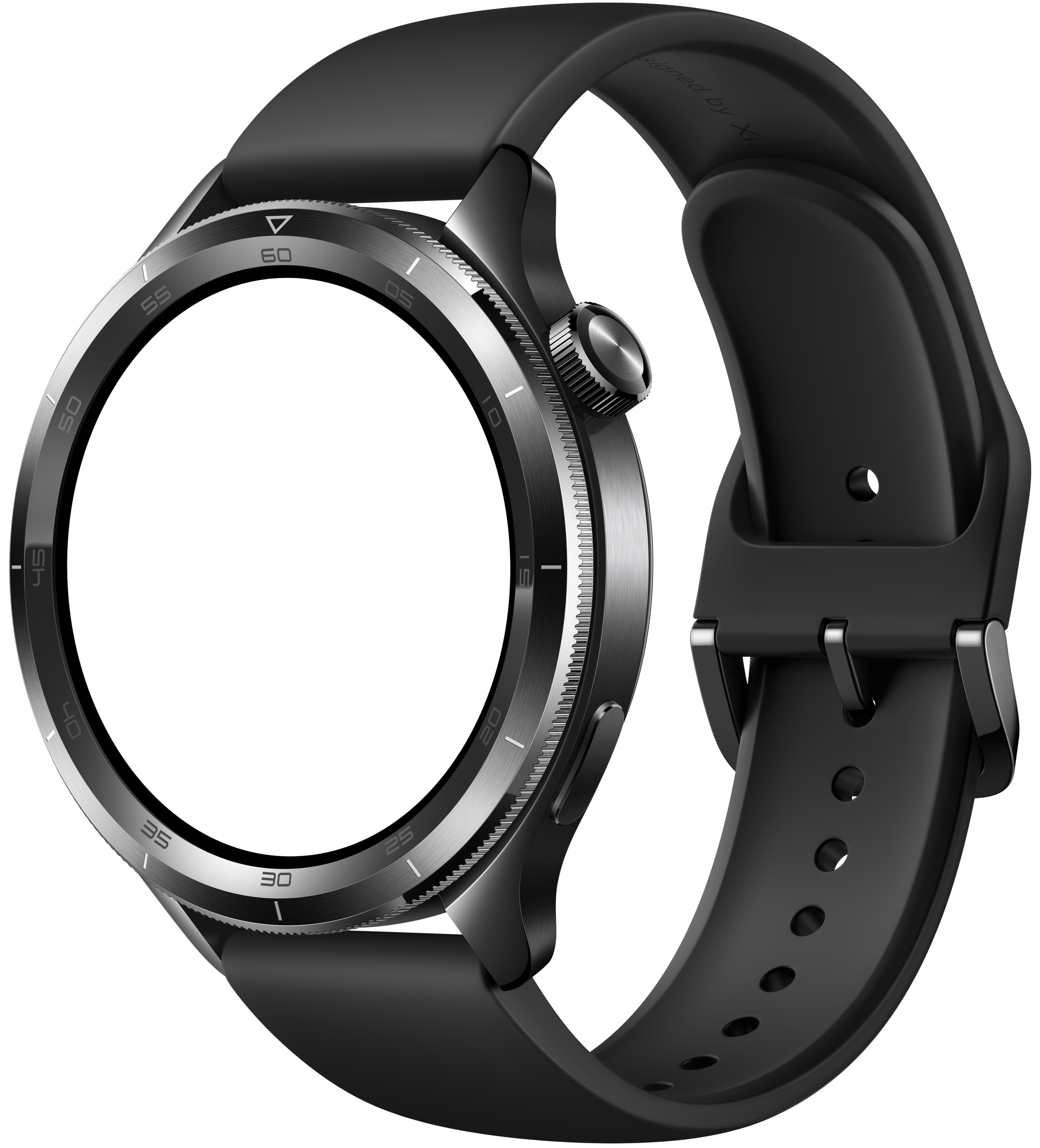 Zegarek posiada okrągłą kopertę o średnicy 47,3 mm i grubości 12 mm, wykonaną ze stopu aluminium. Charakterystycznym elementem konstrukcyjnym jest wymienna luneta (bezel) ze stali nierdzewnej, którą użytkownik może zdemontować i zastąpić innym wariantem kolorystycznym lub materiałowym. Na boku obudowy znajduje się obrotowa korona, służąca do nawigacji po systemie, oraz jeden przycisk funkcyjny. Urządzenie waży 44,5 g (bez paska) i posiada klasę wodoszczelności 5 ATM, co pozwala na pływanie w płytkiej wodzie. Czarny pasek wykonano z fluorokauczuku i jest on przystosowany do nadgarstków o obwodzie od 140 do 210 mm.
