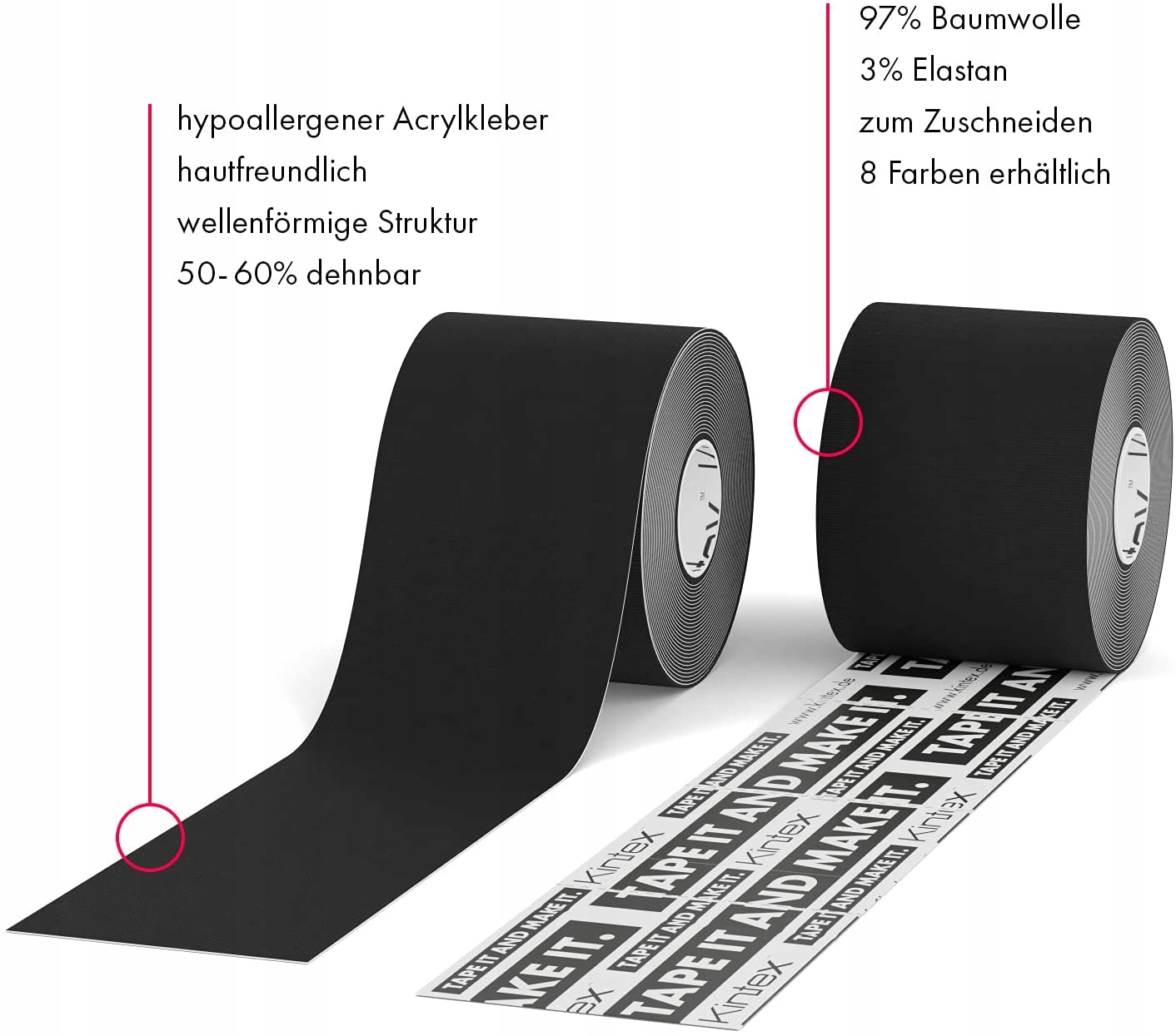 Przyjazna dla skóry taśma do zastosowań kinezjologicznych jest szczególnie elastyczna i, w przeciwieństwie do sztywnych taśm sportowych, również bardzo rozciągliwa. Dzięki hipoalergicznemu klejowi taśmy nie powodują dyskomfortu i są wygodne w noszeniu.