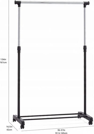 Idealnie nadaje się do prezentowania, sortowania, organizowania i przechowywania strojów. Lekko poruszające się kółka zapewniają łatwy transport. Teleskopowa konstrukcja ułatwia dopasowanie jej do pożądanej przestrzeni do przechowywania. Wytrzymała metalowa konstrukcja ze stabilną powłoką chromową. Wymiary: 43,1 x 87,8 x 106,6-170,1 cm (dł. x szer. x wys.).